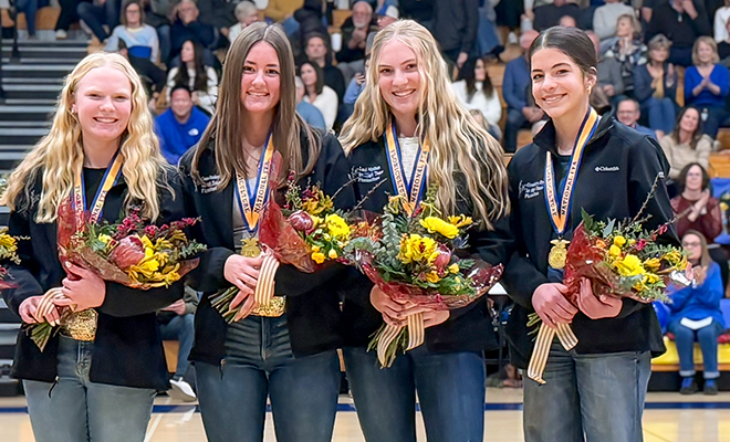 After winning the state championship in spring 2024, the Ripon Christian team of four young ladies, Jeanne Oosterman, Sydney Vandenberg, Cora Vander Meulen and Cailyn Mouw, won the national championship handily, with Jeanne Oosterman also earning First High Individual and Sydney Vandenberg winning Third High Individual overall. Starting over with a new team in 2025, coach Megan Dyk had no expectation of winning the state title again so soon. In fact, the 2025 state finals competition at Cal Poly San Luis Obispo was the first time the new team members competed together. To their surprise, Gracelyn Dyk, Laci Nydam, Lauren Mouw and Geneva Vandenberg were crowned as the first high team and began their journey to Nationals!