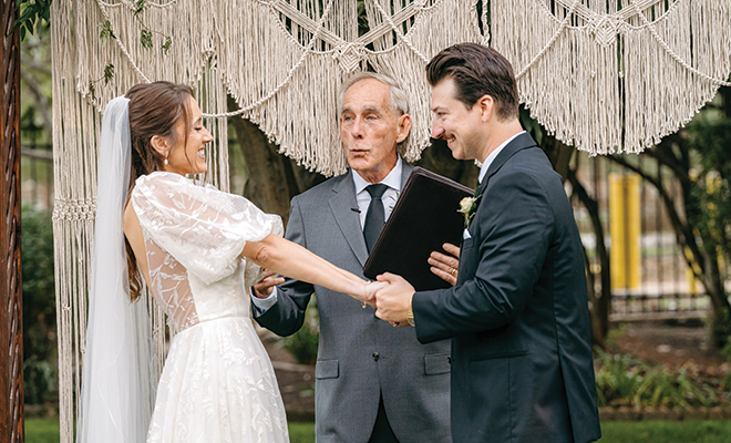 Durst provided a perfect all-in-one venue for guests to enjoy a glass of wine in the garden before witnessing the couple’s vows. Lindsey’s grandfather, Chris Eley, officiated the ceremony and the bride walked down the aisle to a medley of The Sound of Music songs. “Having Lindsey’s grandpa, Chris, officiate was the most special part,” Sam said. “Chris has played a pivotal role in Lindsey’s life, and he and Lindsey’s grandmother, Tola, have always been such a great model for a happy healthy and supportive marriage.” Lindsey’s bestie, Anna Taylor, served as maid of honor. In a unique twist, Lindsey had officiated at Anna’s wedding! Sam’s best friend Christian Rios served as best man. Lindsey carried a bouquet of white peonies and Playa Blanca roses, layered with toffee and cappuccino roses, ranunculus and lisianthus, all softened by Queen Anne’s lace and mixed greenery.