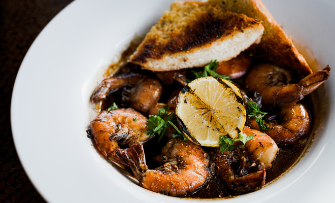 Next was the BBQ shrimp. It’s time to roll up your sleeves and get your napkins ready. Called a New Orleans favorite on the menu, these delicious shrimp are bathed in a house-made creole butter with Worcestershire sauce, lemon, lots of flavored butter and more and served with toasted French bread. I’m so glad Chef Moore left traditions behind and removed the shrimps’ heads for us persnickety Midwesterners, but you still need your hands to remove the shells, kept on for flavor, and that’s just fine with me!